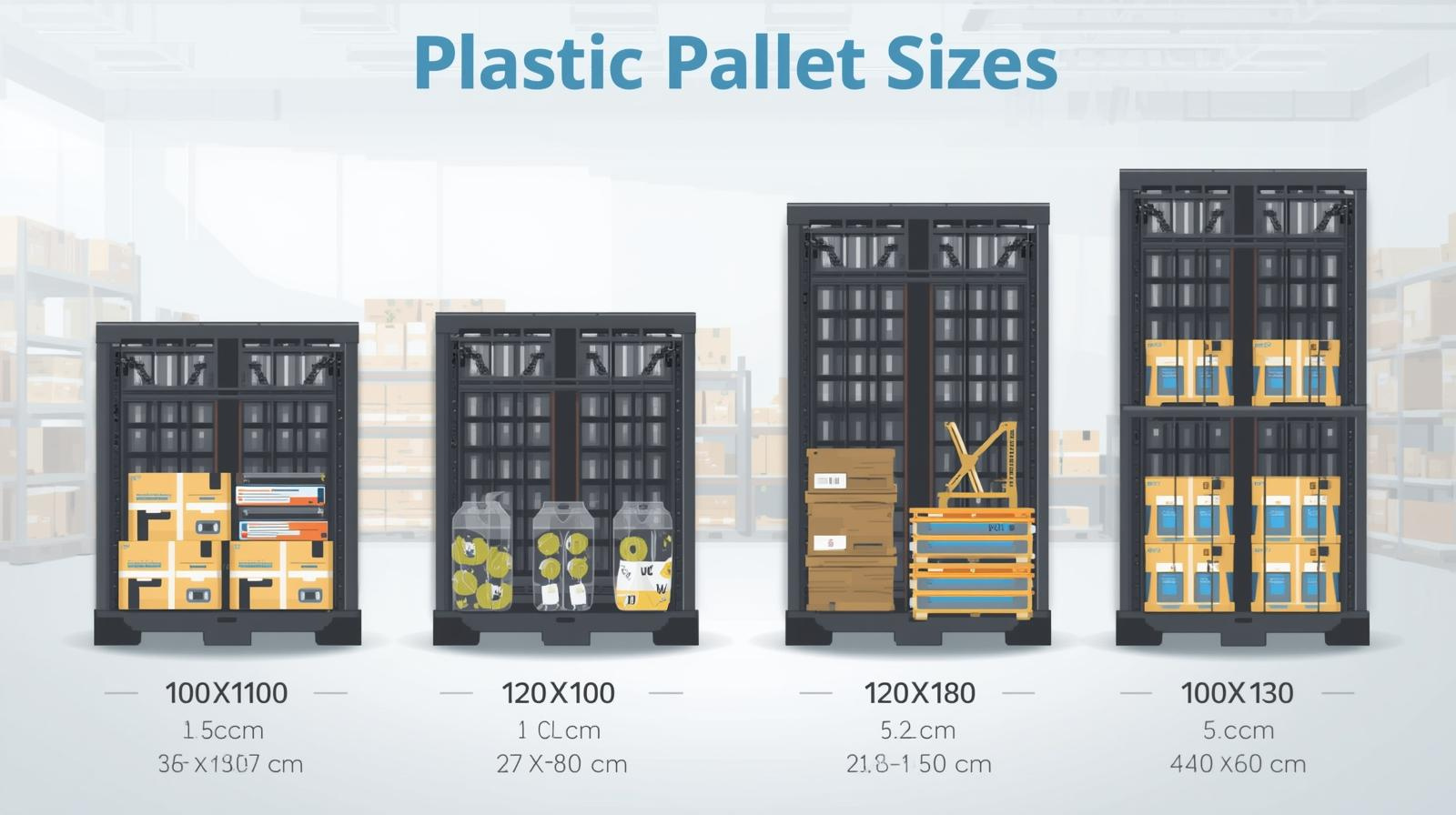 Beberapa ukuran pallet plastik yang umum digunakan di industri antara lain: