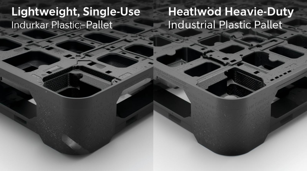 Ilustrasi dari AI perbandingan pallet plastik one way dan heavy duty.