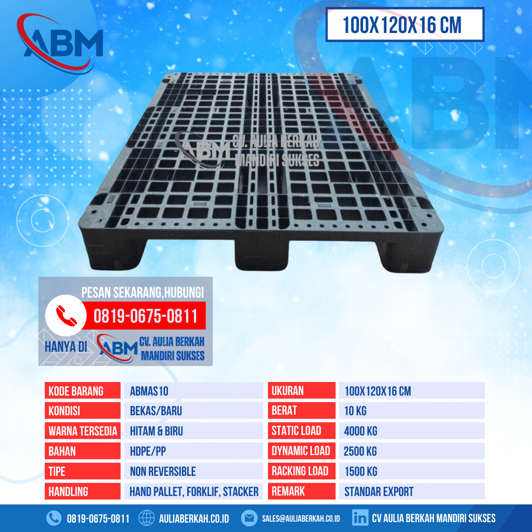 Menjawab kebutuhan tersebut, CV Aulia Berkah Mandiri Sukses menghadirkan Pallet Plastik ABMAS10, berukuran 100x120x16 cm, tersedia dalam kondisi bekas dan baru, serta dibekali spesifikasi yang handal dan kompetitif untuk segala sektor usaha.